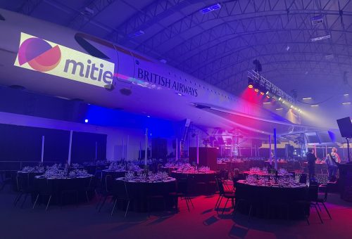 In addition to the outdoor gobo projection, a second gobo was also used inside on to the nose of the plane, that had a slide show of the sponsors of the event, this was visible from the moment attendees walked into the room and allowed for a clear and impressive way to promote the sponsors, that utilises the surfaces within the room.