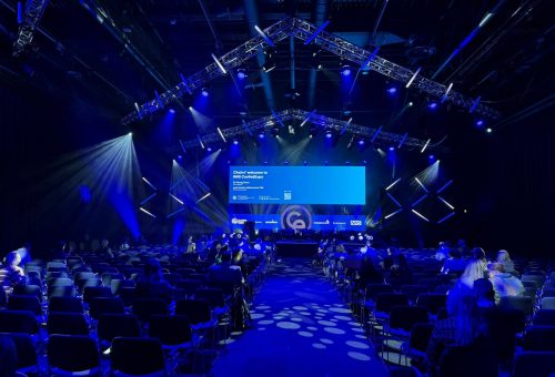 In the main breakout room, a curved LED wall stood out as the key design feature, enhancing the viewing experience and providing a more immersive and visually engaging display. The curvature improved colour accuracy by distributing light more evenly across the screen. Animated sponsor content was shown primarily on the curved LED wall, with additional content displayed on two projection screens on either side. Angled Sceptron tube lighting tied the breakout space in with the rest of the event.