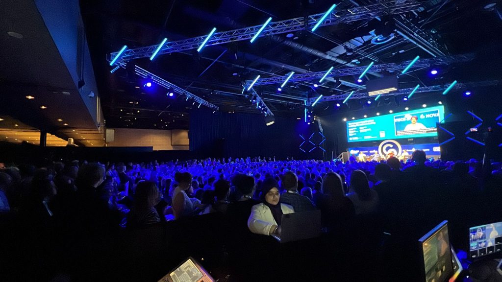 The evening began with a relatively simple awards presentation held on Victoria Warehouse’s mezzanine area. We used moving lights to add impact to the awards presentations and installed a number of large plasma screens and a live camera system to ensure that all guests could see despite the pillars in the room. At the end of the presentations the MC announced “let the party begin” at which point we dropped a wall of drapes revealing pyrotechnics and a view from a balcony looking over the after party area.